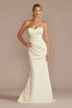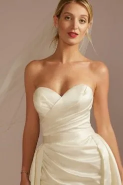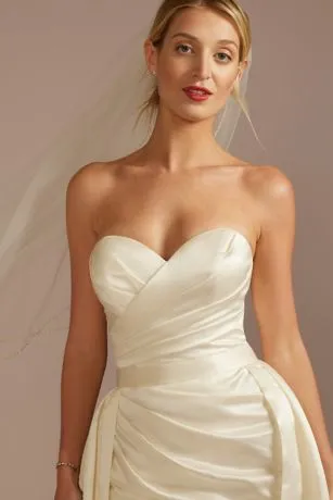 Get swept away in the romance of your big day in a shining satin wedding gown. A soft sweetheart neckline accentuates meticulous bodice ruching atop a sheath skirt. Craving more drama? A removable overskirt adds volume and allows you to switch up your look from the aisle to the dancefloor.