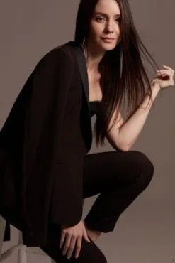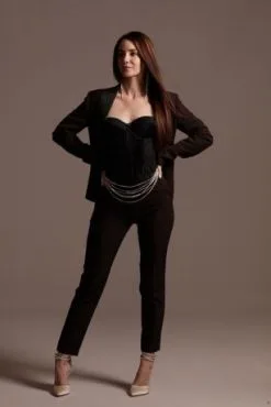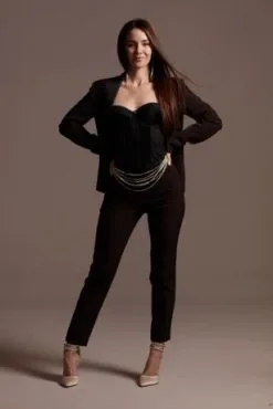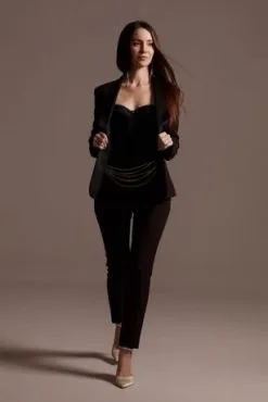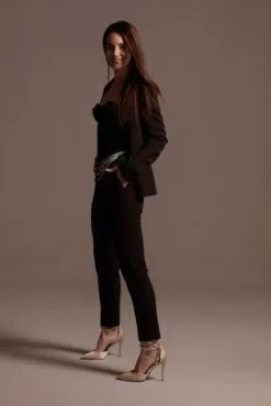 A satin waistband adds a little luster to these fitted suit pants. Pair them with a coordinating jacket and a bustier or tank for a put-together look.