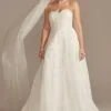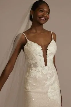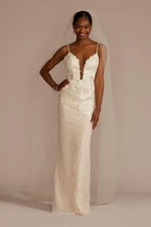 Covered with lustrous sequins and embellished with a hand-placed lace applique, this spaghetti strap plunging wedding dress dares to dazzle. A removable tulle skirt adds a soft, romantic touch to the glamorous look, and gives you the option to switch up your style throughout the day.