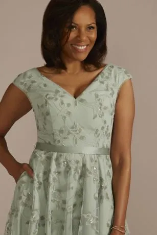 Shimmering sequins define this floral patterned A-line dress designed with cap sleeves and a flattering V-neckline. Mom will love every last detail, from the waist accent to the skirt pockets.