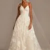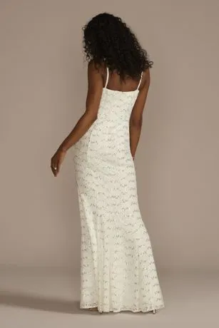 Sparkle is always the answer! Find yourself dazzling in this allover sequin lace wedding dress, complete with a sweetheart corset bodice, skirt slit, and delicate spaghetti straps.