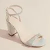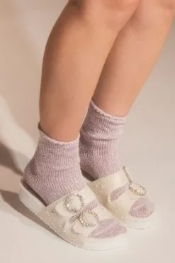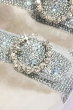 Luxe hippie brides, we have your shoe! This classic two-strap footbed sandal is finished with allover jewels, pearly buckles, and faux-shearling lining to add a cozy finish to all that glam.