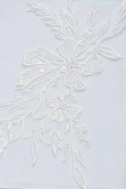 This corset-style wedding dress is as chic as it is sexy. Features a sheer lace applique sweetheart bodice detailed with over 3,000 beads. The grand skirt made from 27 yards of tulle adds flattering shape and movement. A dramatic front slit gives the gown an alluring finishing touch.