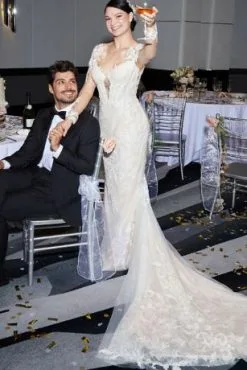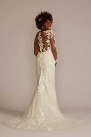 Sexy meets chic on this sheath wedding dress featuring sheer corsetry and illusion lace long sleeves. The tantalizing silhouette is amplified with a stunning illusion open back, figure-flattering ruching, and an artfully designed chapel train.