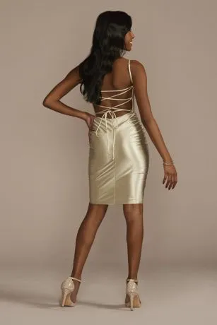 Designed to be seen, this youthful short sheath dress features striking stretch satin fabric and a trendy straight neckline. A lace-up back is the perfect finishing touch for this party look.