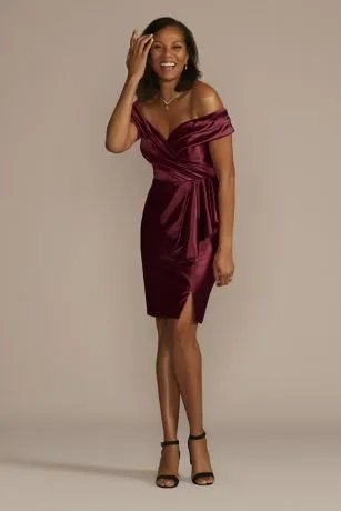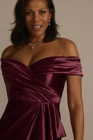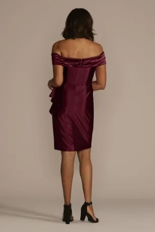 Gathered fabric and a cascading ruffle detail draw attention to this figure-skimming sheath dress crafted with light-catching satin. Mothers of the bride or groom will love the elegant allure of the off-the-shoulder sweetheart neckline.