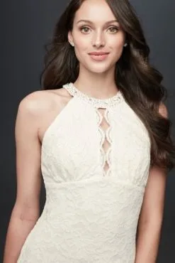 This fun yet sophisticated plus-size short lace dress is perfect for your wedding, rehearsal dinner, or bridal shower. The halter neckline features beading and a scalloped keyhole.