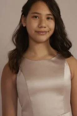 An elegant satin junior bridesmaid dress, this A-line style features a sleeveless bodice, keyhole back, and pockets!