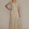 This stunning mesh dress features allover beading, spaghetti straps, a V-neckline and a sleek sheath silhouette. A godet hem completes the look.