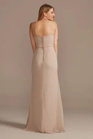 Delicate spaghetti straps, a squared neckline, and a statement ruffle give this chiffon bridesmaid dress a modern boho feel.