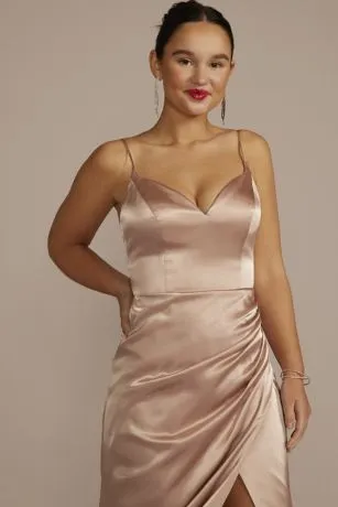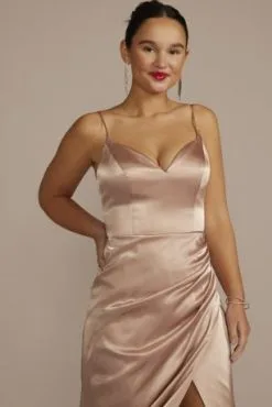 The silky, satiny fabric on this charmeuse bridesmaid dress beautifully catches the light, with a sculpted neckline, side draping, and booty ruching to highlight your figure.
