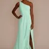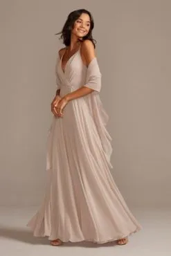 This long chiffon bridesmaid dress gives an aura of dreamy romance from the softly pleated, plunging-V neckline to the billowy, floating full circle skirt. The faux-wrap style bodice is matched with adjustable spaghetti straps to ensure the perfect fit.