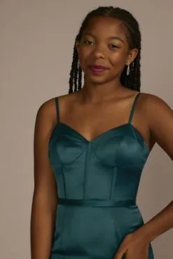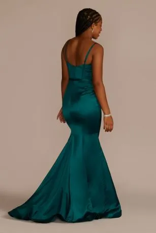 Sexy stretch satin shaped with a corset bodice and mermaid silhouette makes this prom-ready dress the stuff of legends. Seriously…get ready to be the talk of the hallway after wearing this number!