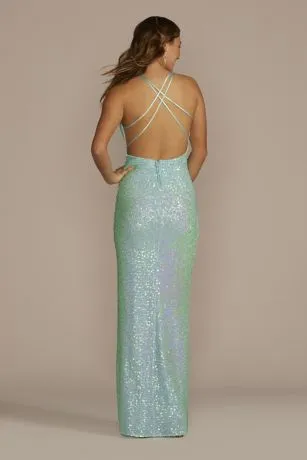 Party in the front… after-party in the back! This prom-ready sheath dress features striking details to show off from all angles. Allover sequins, a flirty skirt slit, and strappy open back to name a few!