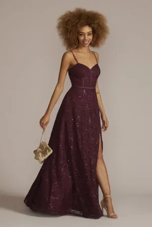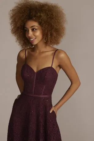 Made from eye-catching sparkle lace, this gorgeous A-line gown guarantees you’ll be seen in a new light (a shimmering one!). Make your debut at prom or any spring formal.