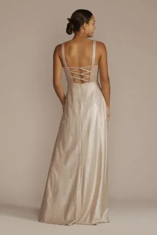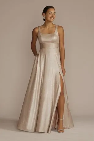 Shimmer metallic shines bright on stretch satin fabric, making this square neck A-line an absolute showstopper. At your next special event, you’ll have plenty of flirty details to show off, from the sexy skirt slit, to the crisscross open back.