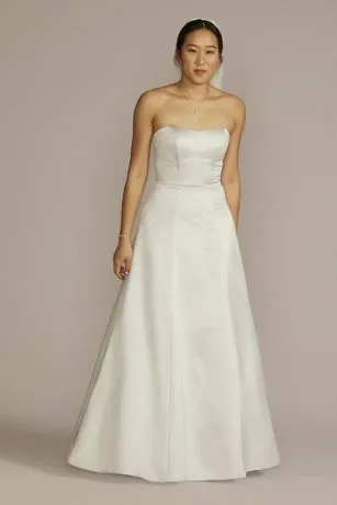 Keep your wedding look simple and stunning in a floor-length satin gown. The strapless bodice and A-line silhouette are universally flattering and scream bridal beauty.