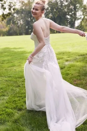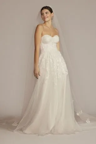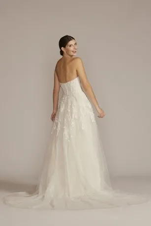 A strapless, sweetheart neck wedding gown is a bridal-favorite for a reason. The exquisitely beaded floral appliques of the dazzling bodice cascade on the glitter tulle skirt like a picturesque dream.