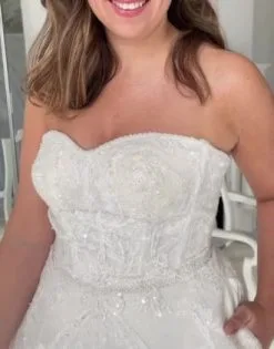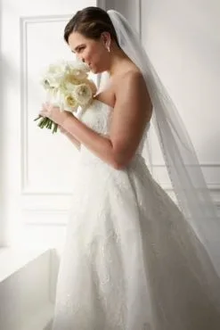 Slip into something a little more elegant! A strapless sweetheart neckline and cathedral train radiate romance paired with a voluminous horsehair-trim ball gown skirt. Carefully handcrafted over 16 hours with thousands of beads and sequins, you’ll inspire oohs and ahhs as you sparkle down the aisle. Best of all? Convenient pockets allow for easy stashing of all your big-day needs.
