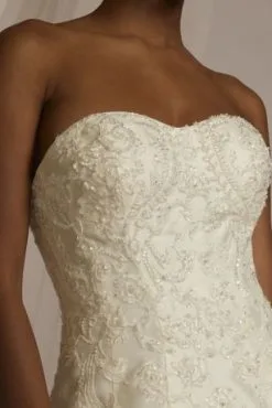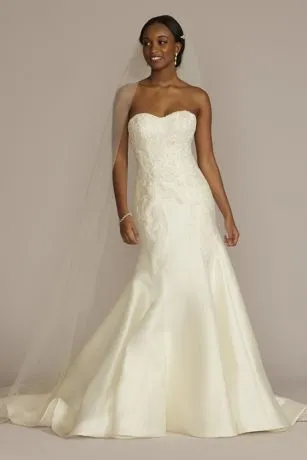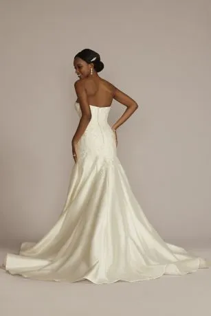 All eyes will be on you in this stunning drop waist wedding dress, adorned with beaded lace appliques at the sweetheart bodice. A mikado mermaid skirt and chapel train make for a dramatic walk down the aisle.