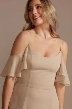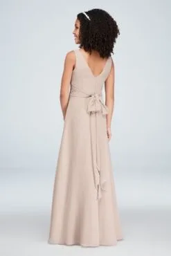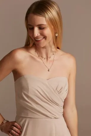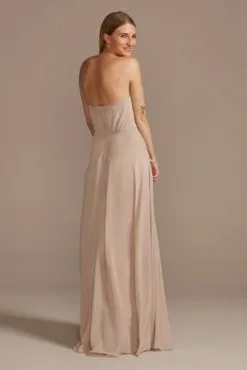 This long chiffon bridesmaid dress gives an aura of dreamy romance from the softly pleated strapless bodice to the billowy, floating full circle skirt.