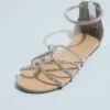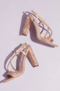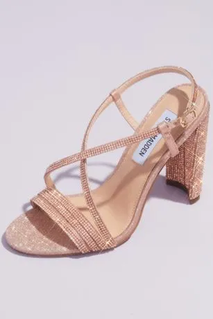 A stellar combo of all the biggest trends, this strappy pair features twinkling allover crystals, curved block heels, and a slightly squared-off toe.