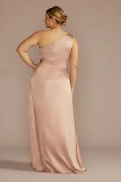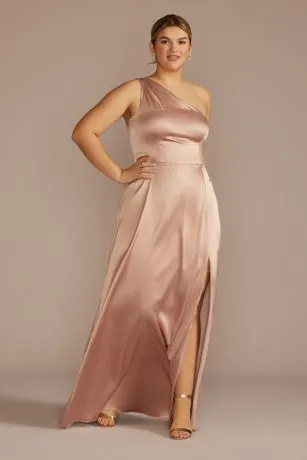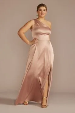 Sexy details like a shoulder cutout and skirt slit take the one-shoulder bridesmaid dress up a notch. The silky, satiny stretch charmeuse fabric makes this A-line all the more appealing.