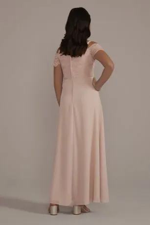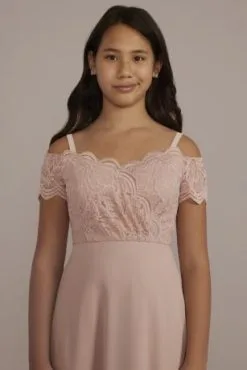 A pretty combo of stretch lace on the bodice and flowy chiffon on the skirt, this junior bridesmaid dress features scalloping at the neckline and off-the-shoulder sleeves.