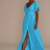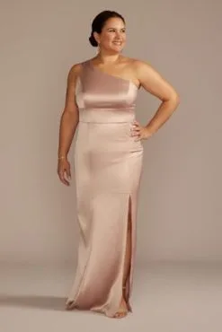 Make your bridesmaids feel glamorous in this sleek one-shoulder satin dress with a skirt slit. The stretch fabric adds comfort to the beautiful formal gown.