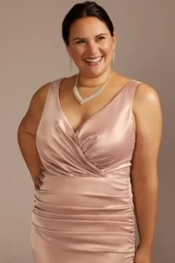 This dress is absolutely stunning! The satin material is so luxurious and the ruching details add a perfect touch of elegance. It fits like a glove and was perfect for my bridesmaid role.