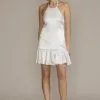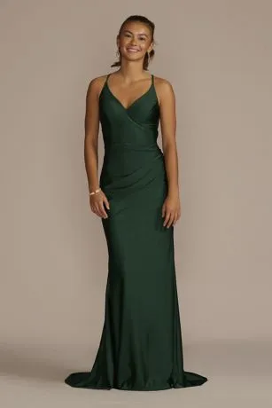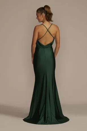 This mermaid style dress is prom-perfect with its sleek figure-hugging silhouette, exquisite draping, and dramatic train. Plus, stretch satin fabric is all the rage this season!