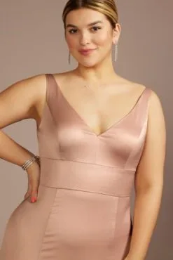 This glamorous stretch satin sheath is an elegant choice for your bridesmaids. Features a classic V-neckline and tank straps.