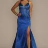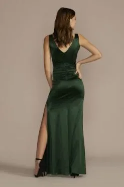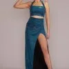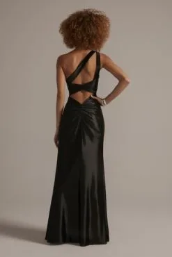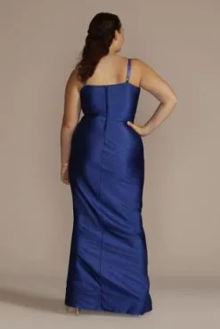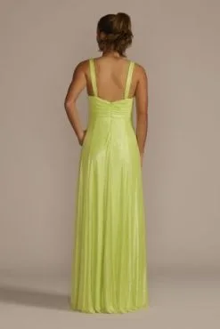 Bodice pleating on this iridescent A-line gives glossy metallic fabric even more ways to catch the light. The floor-sweeping skirt comes complete with handy pockets to hold all your prom or party essentials.