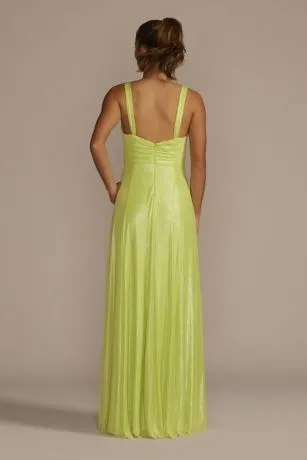 This fun-loving dress upgrades a traditional A-line silhouette with dazzling metallic chiffon fabric. A skirt slit adds flirty detail for a look suitable for a prom queen.