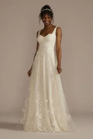 Bring romance to life in more ways than one on your big day. Picturesque lace appliques cover the bodice and A-line skirt of this tulle wedding dress, flowing down the sweep train below. A sweetheart neckline pairs beautifully with the decorated tank sleeves for a truly fanciful look.