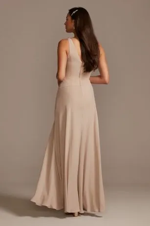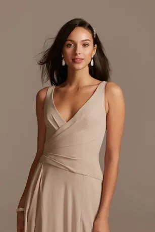 Soft pleating wraps around the bodice of this V-neck georgette bridesmaid dress. The universally-flattering sweeping skirt features a cascade ruffle and a side slit that lends graceful movement.
