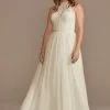 Fun, flirty, and undeniably beautiful, this tank wedding dress is detailed with embroidered lace, a plunging neckline, and a tulle tea-length skirt.