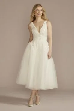 Fun, flirty, and undeniably beautiful, this tank wedding dress is detailed with embroidered lace, a plunging neckline, and a tulle tea-length skirt.