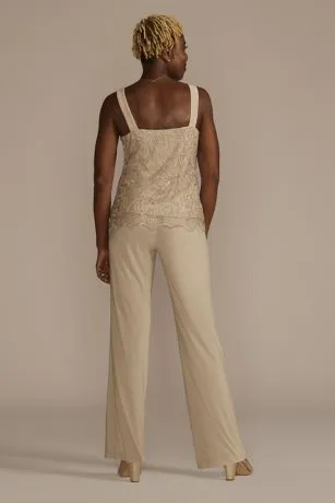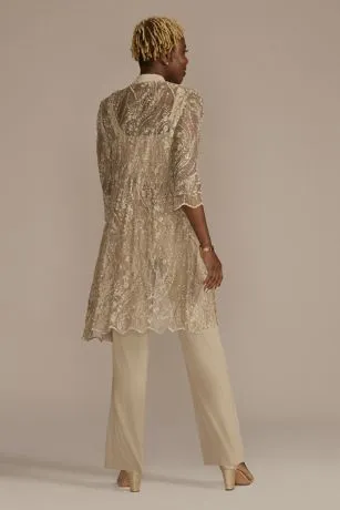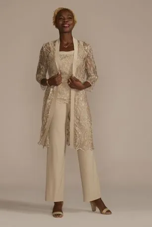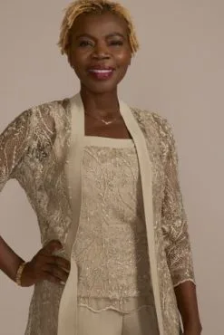 This three-piece pants suit offers a comfortably chic look for most of Mom’s events. Soft, relaxed trousers give the kind of ease she loves, while the embroidered top and illusion lace jacket shimmer with the sparkle she deserves.