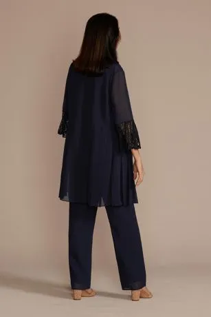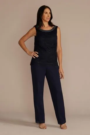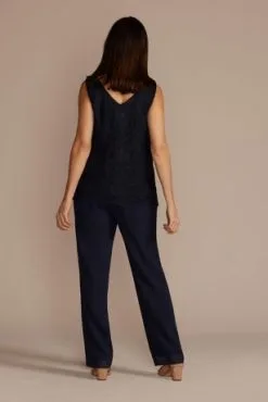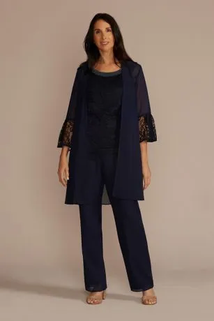 With this versatile three-piece pantsuit, Mom can have a dramatic outfit change, too! For ceremony-ready coverage, the open-front, bell-sleeve georgette duster keeps things classy and chic. When it’s time to party, reveal the textured lace tank with a gorgeous embellished neckline.