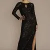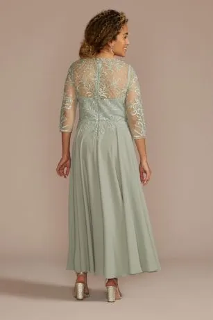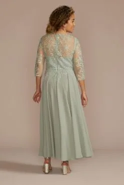 The bodice of this A-line is a true work of art. With breathtaking appliques, intricately detailed over illusion three-quarter sleeves, a sweetheart neckline, and open back, onlookers will admire any mother of the bride or groom who wears this dress.