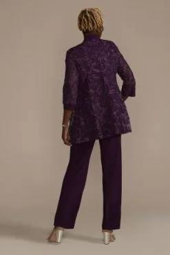 Swirls of soutache embroidery adds beautiful texture to the jacket and tank of this three-piece set perfect for mom or grandma. Soft jersey pants provides a delicate contrast.