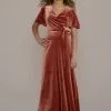 A stunning bridesmaid dress with sexy details, this satiny charmeuse style ties at the neckline, with an open back and a high slit on the side-draped skirt. Booty ruching helps flaunt your assets. Features bra cups.