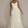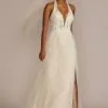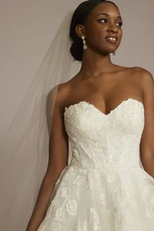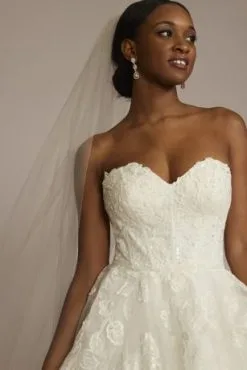 If you’re dreaming of princess vibes, a ball gown wedding dress is a must! It takes nearly 15 hours, four fabrics, 16 yards of organza, and two types of lace appliques to create the full tiered silhouette straight out of a fairy tale. A strapless sweetheart neckline and dramatic chapel train complete the magical aesthetic, no fairy godmother needed!