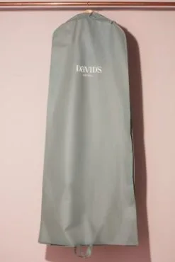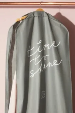 Perfect for your wedding dress or any special ensemble, this roomy garment bag is designed to accommodate even the fullest of gowns. Featuing our signature “Time to shine” script, the bag is crafted of durable, non-woven fabric and is finished with a reinforced hanger hole, bottom loops for easier gathering and carrying, and a clear vinyl accessories pocket.