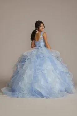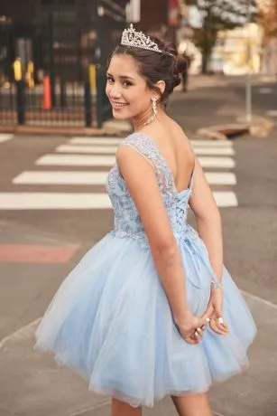 Que hermosa! Make your quince an unforgettable event with this stunning lace-up transformer gown. A detachable ruffled overskirt sits atop a short, lace embellished dress for the ultimate mid-party reveal.