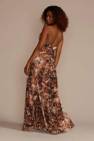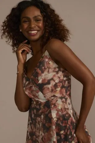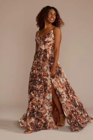 Searching for the perfect transitional party look? You’ve just found it! This print maxi dress features an array of autumnal colors that will stand out at any occasion this season, from weddings to galas. The wrap style bodice makes for a flattering silhouette, and a skirt slit adds movement to your every step.