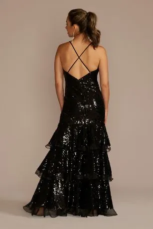 Get ready to strike a pose because this tiered mermaid dress belongs on the red carpet, or better yet, at your next special event. You’ll sparkle from every angle thanks to allover sequins, a deep V-neckline, and sexy open back.