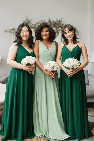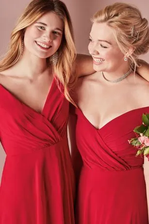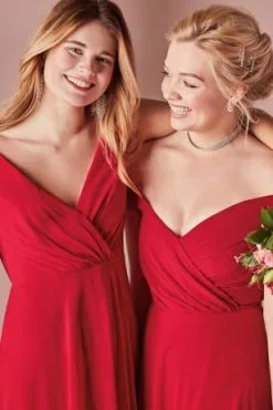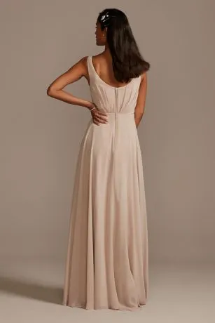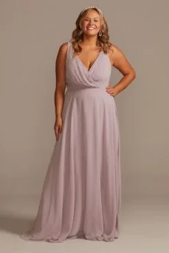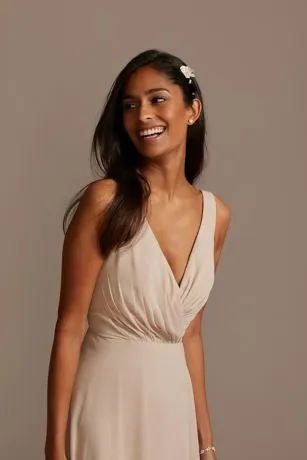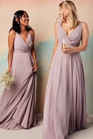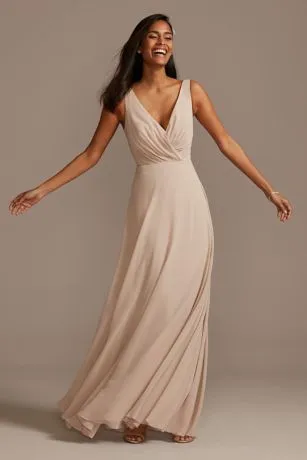 This long chiffon bridesmaid dress gives an aura of dreamy romance from the softly pleated, plunging-V neckline to the billowy, floating full circle skirt. The faux-wrap style bodice is finished with a V-neckline and tank straps.