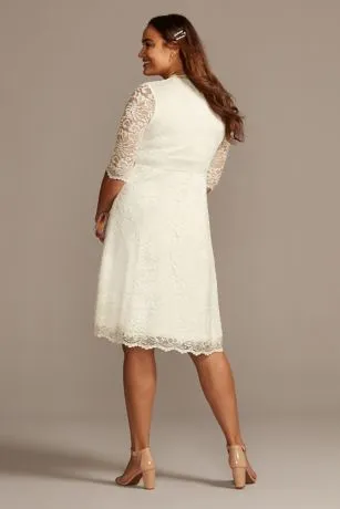 The definition of short and sweet, this knee-length lace plus-size wedding dress is perfect for your special day. The A-line silhouette features scalloped lace detailing at the neckline, illusion sleeves, and hemline, while the high waist nips in at the most flattering point. Designed exclusively for plus-size figures.